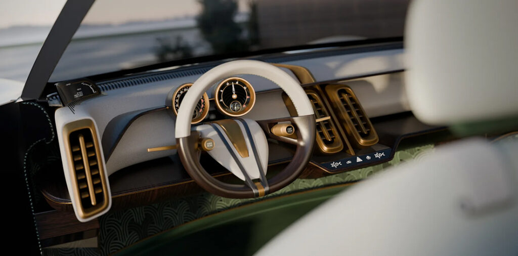 Perante tudo o isto, obrigatoriamente, o interior também teria de romper os moldes da indústria, até os menos convencionais. Desde logo porque, segundo a empresa italiana, a bordo não existem bancos, mas peças de mobiliário, com o intuito de criar uma espécie de salão privado na traseira, onde a tecnologia (ecrãs, botões de comando, controlo da climatização – com regulação da humidade, e capaz de libertar uma fragrância ajustada ao perfil dos passageiros) só se torna presente quando necessário, dado que quase tudo no interior pode ser gerido através de um sistema de inteligência artificial capaz de, através de comandos vocais, controlar o ar condicionado, a iluminação ambiente ou o sistema de som, entre muitas outras funções.