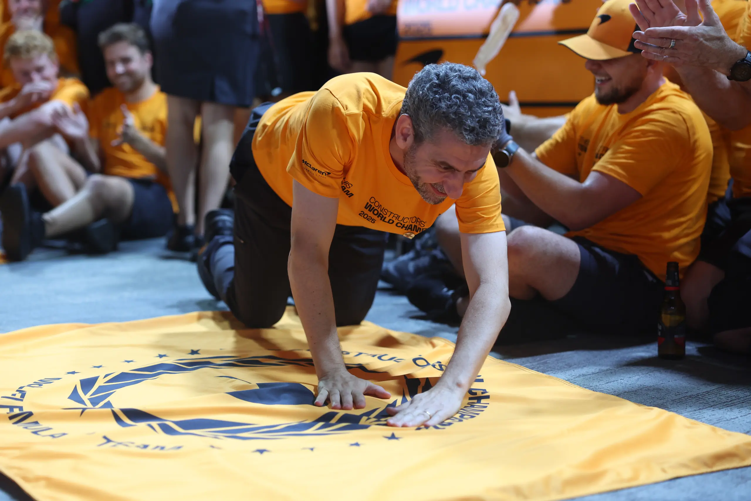 SINGAPORE, SINGAPORE - OCTOBER 05: Andrea Stella, Team Principal of McLaren and the McLaren team celebrate after winning the Constructors Championship during the F1 Grand Prix of Singapore at Marina Bay Street Circuit on October 05, 2025 in Singapore, Singapore. (Photo by Andy Hone/LAT Images)