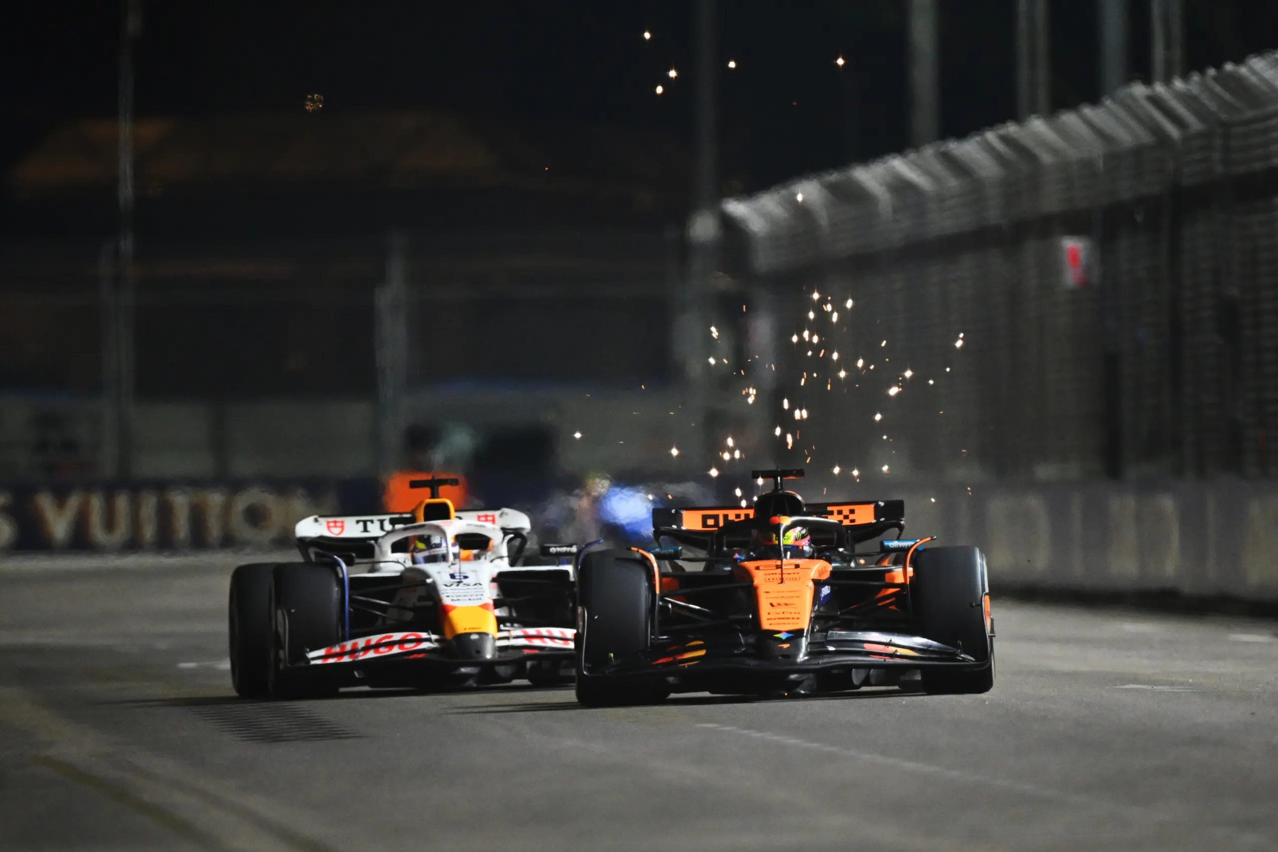SINGAPORE, SINGAPORE - OCTOBER 05: Oscar Piastri of Australia driving the (81) McLaren MCL39 Mercedes leads Isack Hadjar of France driving the (6) Visa Cash App Racing Bulls VCARB 02 on track during the F1 Grand Prix of Singapore at Marina Bay Street Circuit on October 05, 2025 in Singapore, Singapore. (Photo by Clive Mason/Getty Images) *** BESTPIX ***