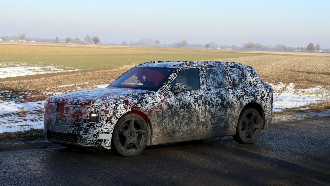 The prototypes are still circulating with camouflage, but they already allow for the identification of rectangular front headlights positioned immediately below thin strips of daytime running lights, as well as an upright front grille and a lower air intake with markedly angular geometry. The Spirit of Ecstasy, the iconic hood ornament of the brand, is hidden — as is customary in pre-series prototypes. In profile, the resemblance to the Cullinan is undeniable, although the ground clearance and the front and rear overhangs present slightly different proportions.