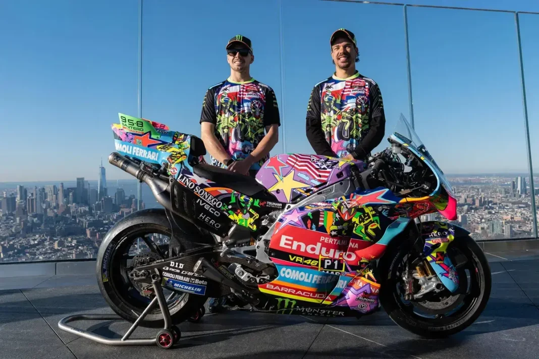 In an electrifying display of motorsport artistry, the VR46 team has unleashed a breathtaking new livery for the upcoming US MotoGP at COTA, and they did it in style—high above the streets of New York City! Riders Fabio di Giannantonio and Franco Morbidelli took center stage at the Edge Skydeck in Hudson Yards, one of the towering giants of the Big Apple, to reveal their striking design that captures the essence of American culture.