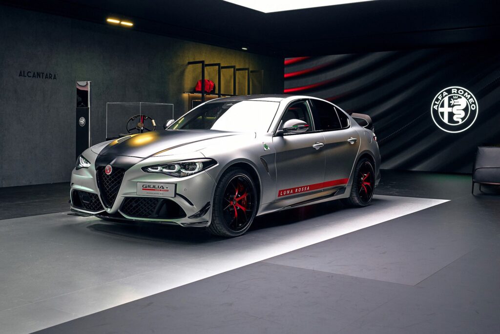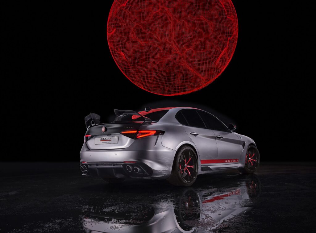 O Giulia Quadrifoglio Luna Rossa exibe, ainda, uma decoração exterior artesanal inspirada no veleiro de competição Luna Rossa AC75 de 202, com um acabamento artesanal iridescente que recria o reflexo metálico do aço, sobre o qual é aplicada a pintura bicolor com uma faixa lateral vermelha e a inscrição do símbolo do clube napolitano que representa Itália na Taça América (Circolo del Remo e della Vela Italia). Patrizio Bertelli, administrador-delegado da Prada, é o proprietário de uma equipa que tem Max Sirena como skipper desde 2011.