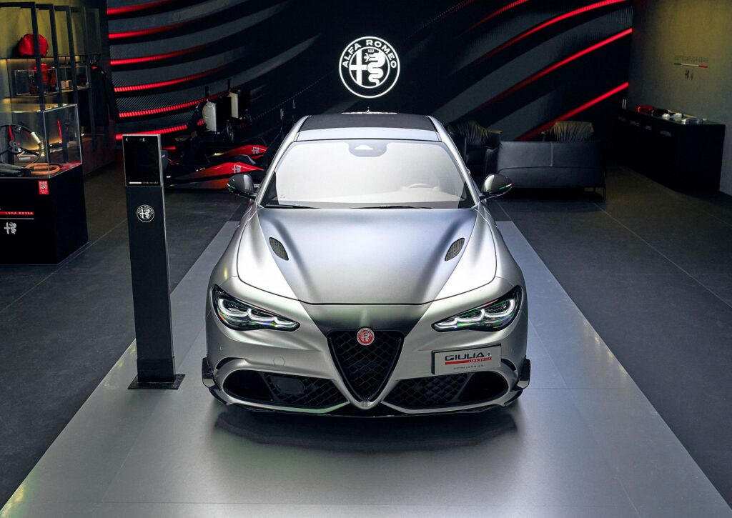 Em destaque no espaço da Alfa Romeo no Salão Automóvel de Bruxelas, certame que decorre até ao próximo dia 18, o Giulia Quadrifoglio Luna Rossa é a expressão mais desportiva e exclusiva da berlina da casa de Arese, contando com um pacote aerodinâmico que sobressai tanto pela exuberância, como pela eficiência. A marca italiana produzirá apenas dez exemplares de uma versão que comemora a sua associação à equipa que, em 2027, representará Itália na edição 38 da Taça América, a competição mais antiga do desporto mundial, a realizar em Nápoles.