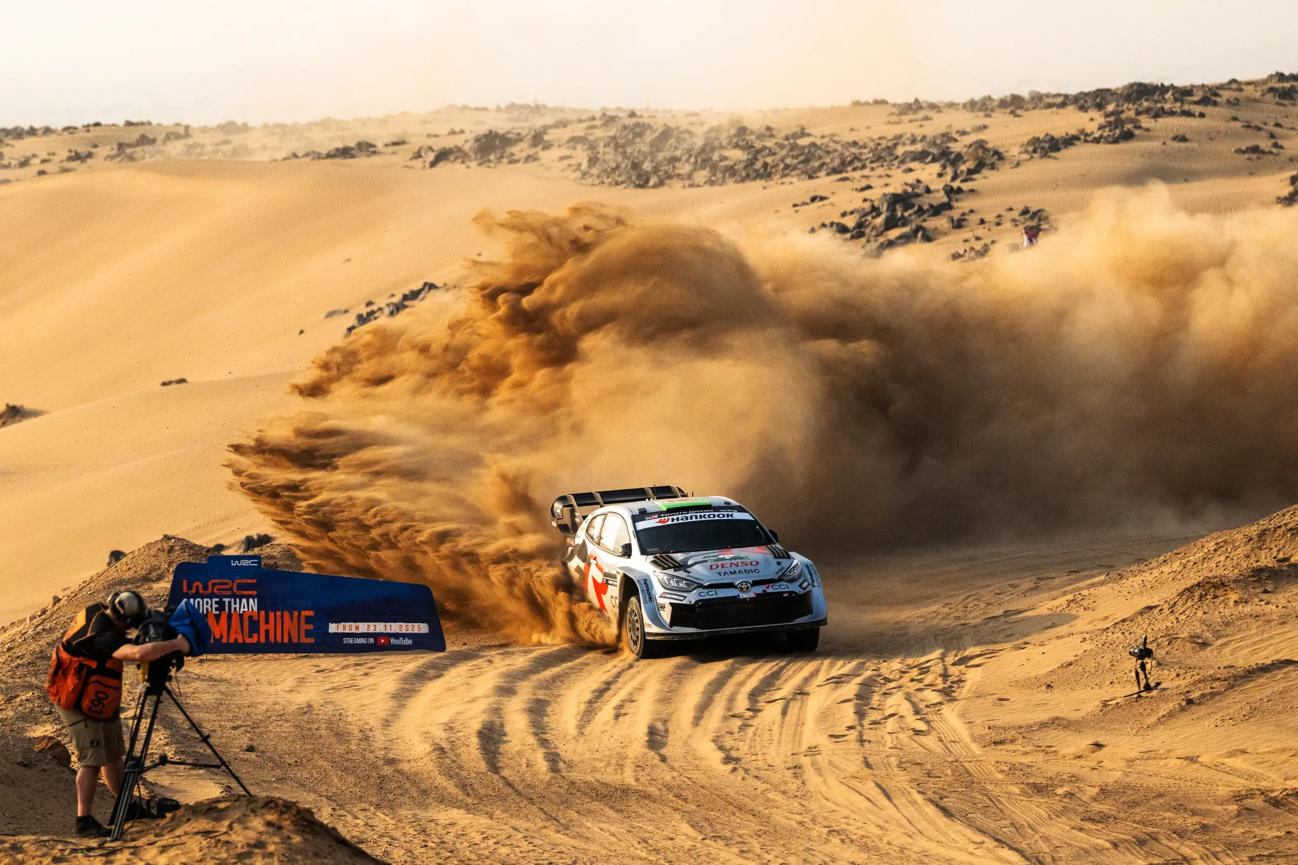 初日の埃が収まると、アドリアン・フールモーのリードはわずか2.9秒にまで削られ、緊張感が高まりました。待望のステージ11、ワディ・アルマトウィ1—過酷な24.90 kmの区間—は競技者たちにとって地雷原となりました。エバンスは冒頭で左後輪が致命的なパンクを起こし、急いでタイヤ交換を行うために1分38秒の苦痛を伴う停車を余儀なくされました。この骨折りの努力の結果、彼は10位に後退し、M-Sportのグレゴワール・ミュンスターに12.8秒遅れをとりました。