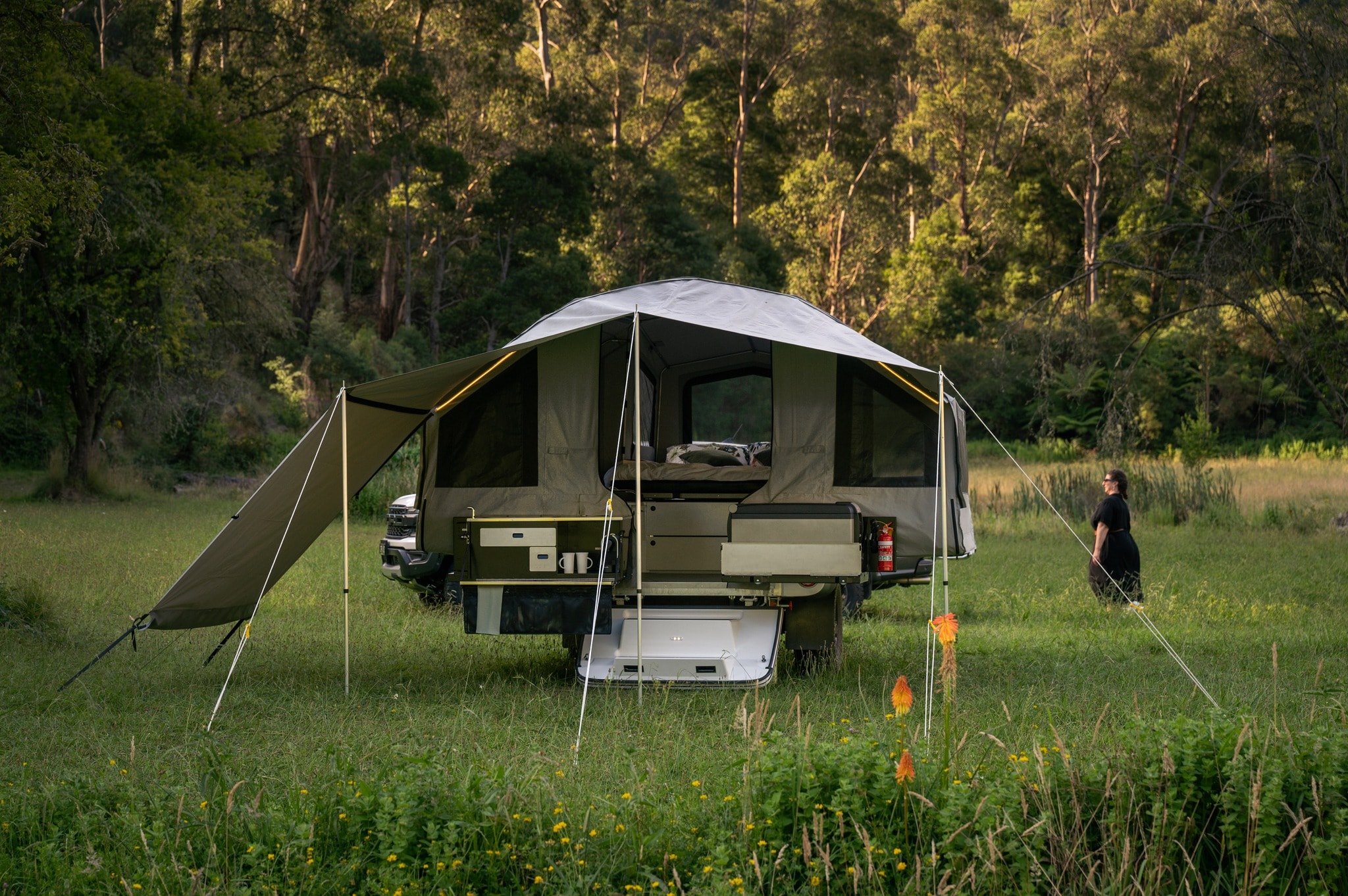 ユニットの後部には素晴らしい屋外キッチンがあります。キャンプ場やどこでも場所を確保したら、ケルフトンの側面を展開して大きな居住スペースを露出させ、その後すぐにキッチンを設置します。居住スペースについて話すと、展開すると、折りたたまれた状態から1.7mから2.7mの高さを見ることができます。