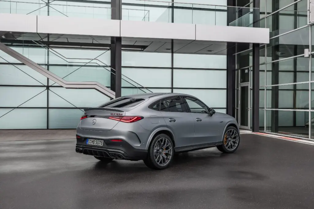 Já a traseira é marcada pelos farolins com um elemento de ligação preto e vermelho-escuro. O para-choques traseiro específico da AMG, está dotado de um difusor simulado (GLC 43) ou com uma placa difusora adicional (GLC 63 S), bem como os revestimentos das duas ponteiras de escape duplas (redondos no GLC 43, trapezoidais no GLC 63 S) que reforçam a imagem de um modelo desportivo.